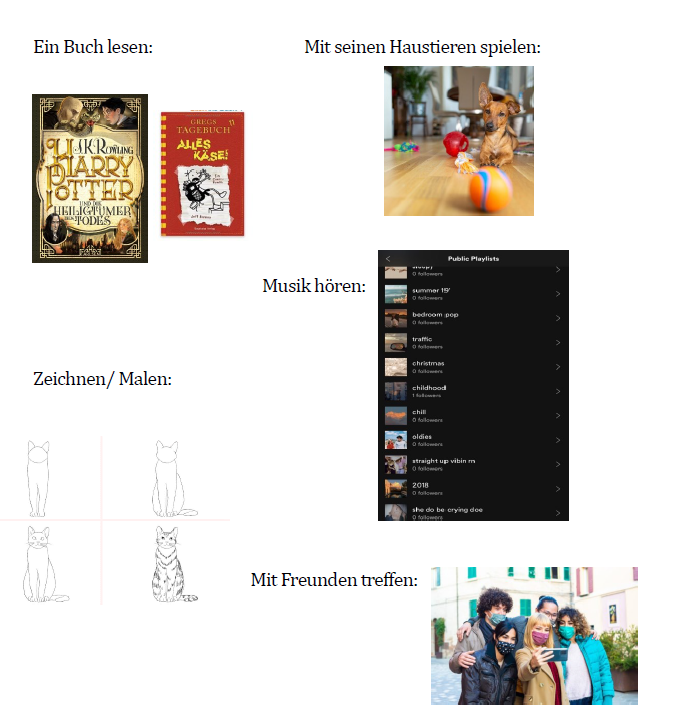 Ein solches Projekt haben auch die Schülerinnen und Schüler der Klasse 6d durchgeführt. Sie waren kreativ und haben in Kleingruppen „Tipps gegen Langeweile“ zusammengestellt. Es sind tolle Ergebnisse entstanden, die wir euch nicht vorenthalten wollen. Vielleicht findet ihr darunter den einen oder anderen Tipp, der euch gefällt und den ihr (sobald dies wieder möglich ist) selbst ausprobieren wollt.