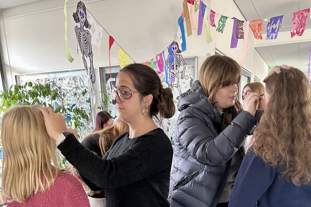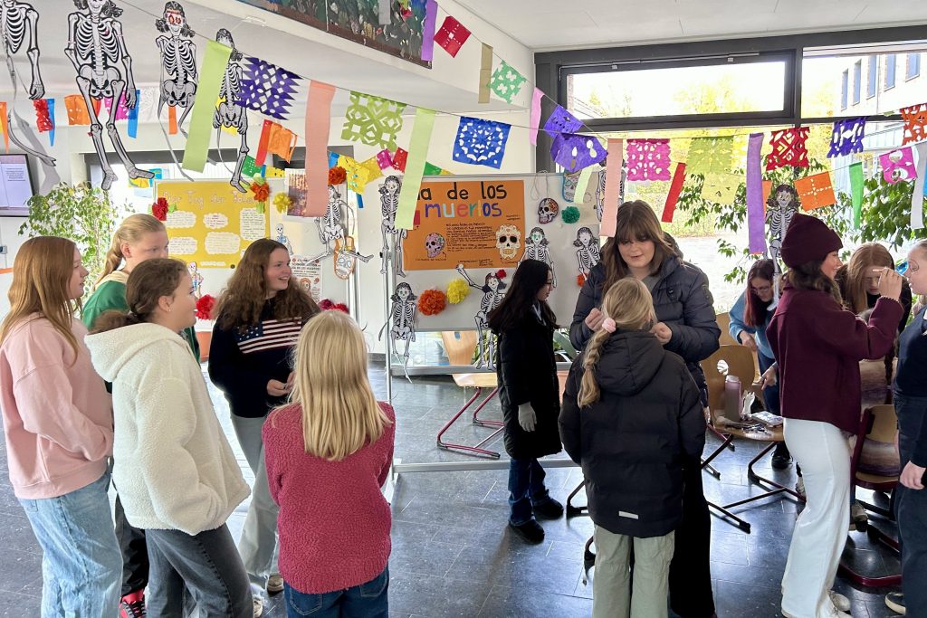Ein besonderes Highlight war unsere Schminkaktion: Viele freiwillige Schülerinnen und Schüler ließen sich im typischen Stil des „Día de los Muertos“ schminken – mit kunstvollen Mustern, Blumenkränzen und dem bekannten „Calavera“-Gesicht. So begegnete man in den Gängen zahlreichen fröhlichen „catrinas“ und „catrines“, die mit ihren leuchtenden Farben für Begeisterung und staunende Blicke sorgten und das Schulhaus in ein mexikanisches Fest verwandelten.