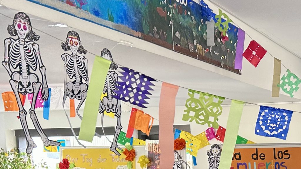 Auch bei uns war die Schule an diesem Tag mit farbenfrohen Plakaten, selbst gebastelten Skeletten und Girlanden sowie kleinen Altaren geschmückt. Schülerinnen und Schüler der Spanischkurse aus den Jahrgängen 7 bis 13 hatten im Unterricht informative Ausstellungen vorbereitet, in denen sie die Bedeutung und Geschichte des Feiertags erklärten. So konnten alle Besucherinnen und Besucher einen Einblick in diese faszinierende Tradition gewinnen.