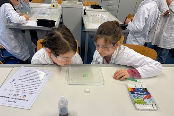 Im Mittelpunkt des Labortages standen spannende Experimente zur Farbchromatografie, bei denen die Kinder Farben auf ihre chemischen Bestandteile untersuchten. Sie erforschten zudem die sauren und basischen Eigenschaften von Stoffen und das Lösungsverhalten von verschiedenen Materialien. Besonders aufregend war es, die chemischen Reaktionen der „Natronrakete“ zu erleben und die bunte Magie einer selbstgemachten Lavalampe zu beobachten. Diese Experimente sorgten für viele „Wow“-Momente und staunende Gesichter.