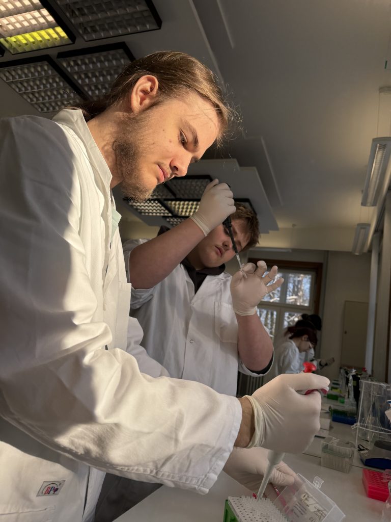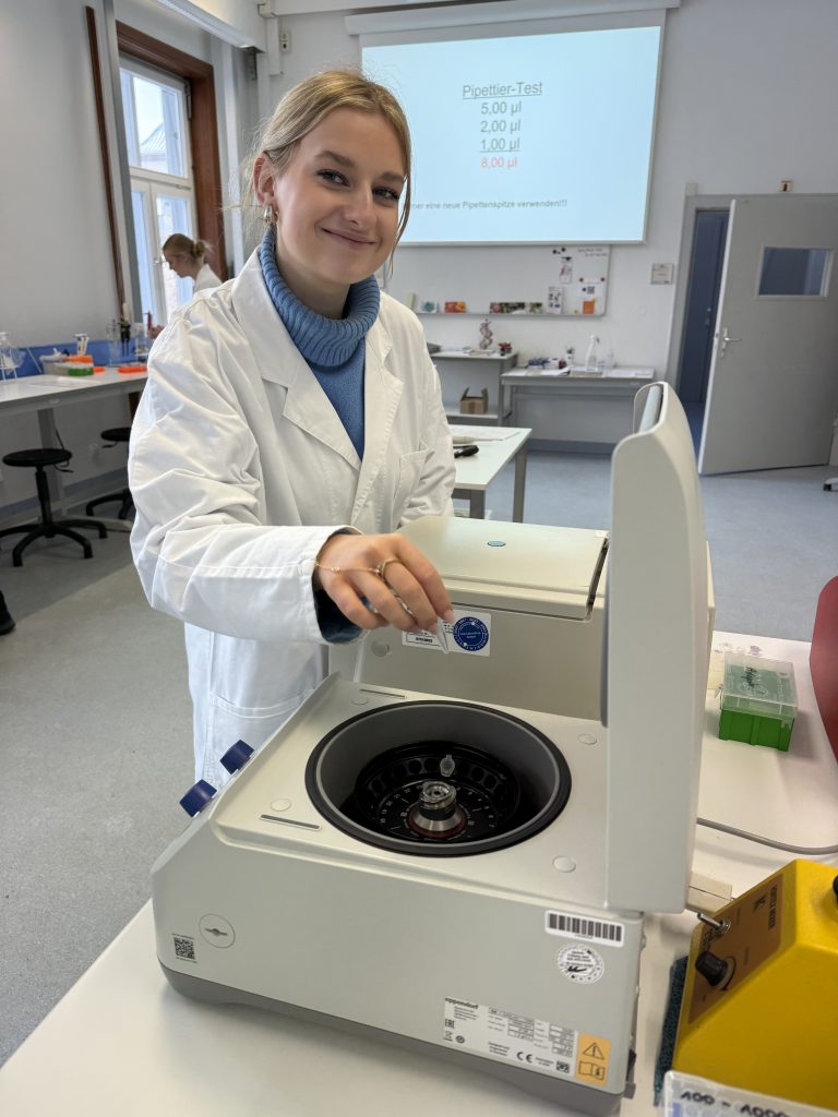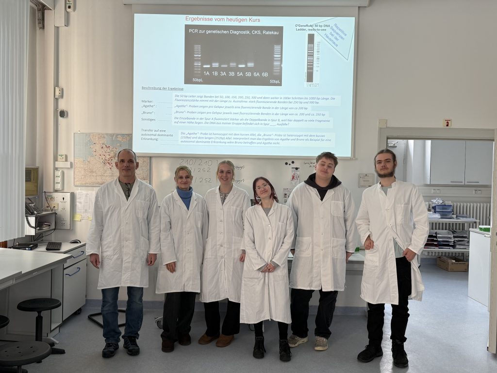 Gerade waren die Weihnachtsferien vorbei und schon ging es am ersten Schultag für das Biologieprofil des 12. Jahrgangs direkt in die Vollen. Es stand ein Besuch im Lübecker offenes Labor an. Nach 2 ½ Wochen gemütlichem Alltag, feistem Festtagsschmaus und zahlreichen Geschenken stand nun ein ganzer Tag im Labor an. Das Kursthema „Polymerasekettenreaktion (PCR) zur genetischen Diagnostik“ war im Unterricht intensiv vorbereitet worden und die Vorfreude bei den Schülerinnen und Schülern auf die praktische Anwendung des erworbenen Wissens war groß. Um 9.30 Uhr traf sich die kleine Gruppe von 6 Schülerinnen und Schülern bei tiefwinterlichem Wetter vor dem pittoresken Turm auf den Campus des Universitätsklinikums. Das Labor im Inneren wirkte hochmodern und für die Gruppe etwas überdimensioniert. Hier passen auch locker über 20 Personen hinein. Frau Klein, die leitende Diplombiologin für den Tag, empfing uns herzlich und wir wurden schnell mit Laborkitteln und Schutzbrillen ausgestattet und erhielten die obligatorische Sicherheitsbelehrung. In den folgenden Stunden wurde viel pipettiert, so dass zahlreiche unterschiedliche Flüssigkeiten in kaum sichtbaren Mengen auf dem Mikroliter genau miteinander gemischt wurden. Nicht nur äußerst konzentriert und genau musste gearbeitet werden, auch auf die Hygiene war strengstens zu achten, damit die DNA-Proben nicht mit fremder DNA kontaminiert wurden. Am Ende ging der hergestellte Zaubertrank in einen sogenannten Thermocycler, der die DNA tausendfach vervielfältigte um genügend Material für die später durchzuführende Gelelektrophorese zu haben. So konnten wir feststellen, welche der beiden „Versuchspersonen“ wohl mit der ominösen Huntington-Krankheit lebte. Immerhin 3 von 4 durchgeführten Versuchsansätzen zeigten ein eindeutiges Ergebnis. Der eine Fehlansatz führte aber auch zu wichtigen Erkenntnissen, konnten die Schülerinnen und Schüler an diesem Beispiel doch intensiv überlegen, wo mögliche Fehlerquellen lagen. Nach bald 8h, die neben der praktischen Arbeit immer wieder auch durch Theorieeinheiten unterbrochen wurden, war die Gruppe gut erschöpft, aber auch sehr zufrieden mit dem Geleisteten. Das durchweg positive Resümee der Gruppe war insbesondere der professionellen und freundlichen Durchführung des Kurses, wie auch dem hohen praktischen Anteil geschuldet. Die Cesar-Klein-Schule freut sich schon auf ihren nächsten Besuch im Lola, denn hier sind wir zumindest mit unserem Biologieprofil ein regelmäßiger Gast.